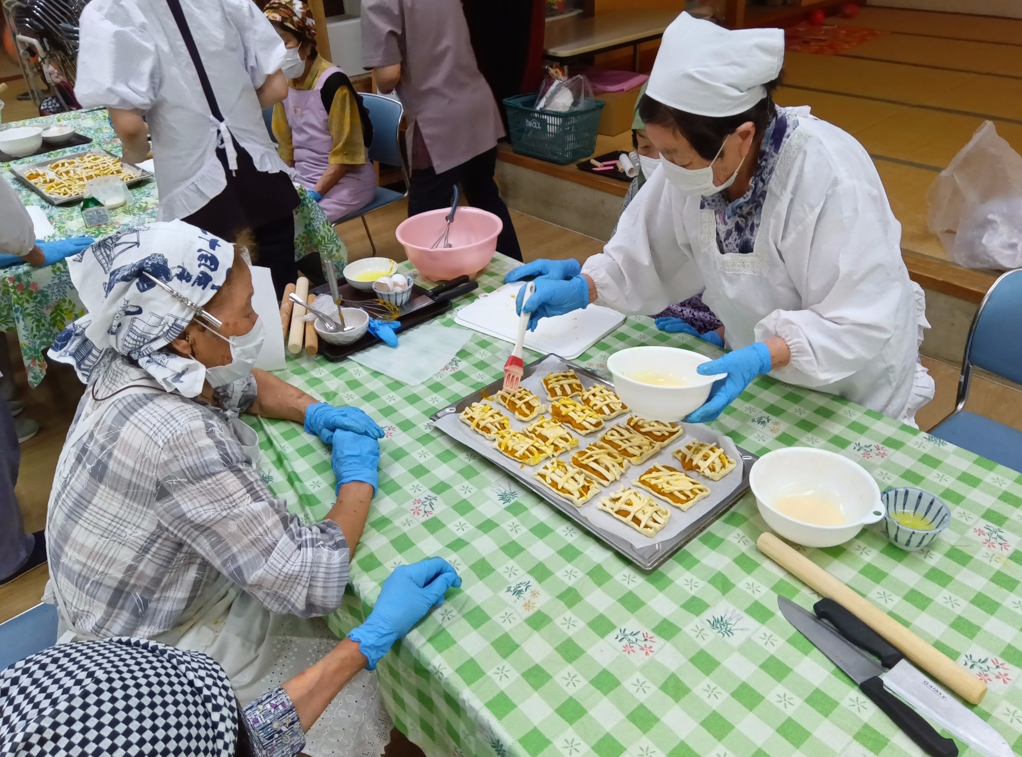 厨房にて事前にカボチャの種抜きや皮むきを蒸してもらい、潰していく所から!