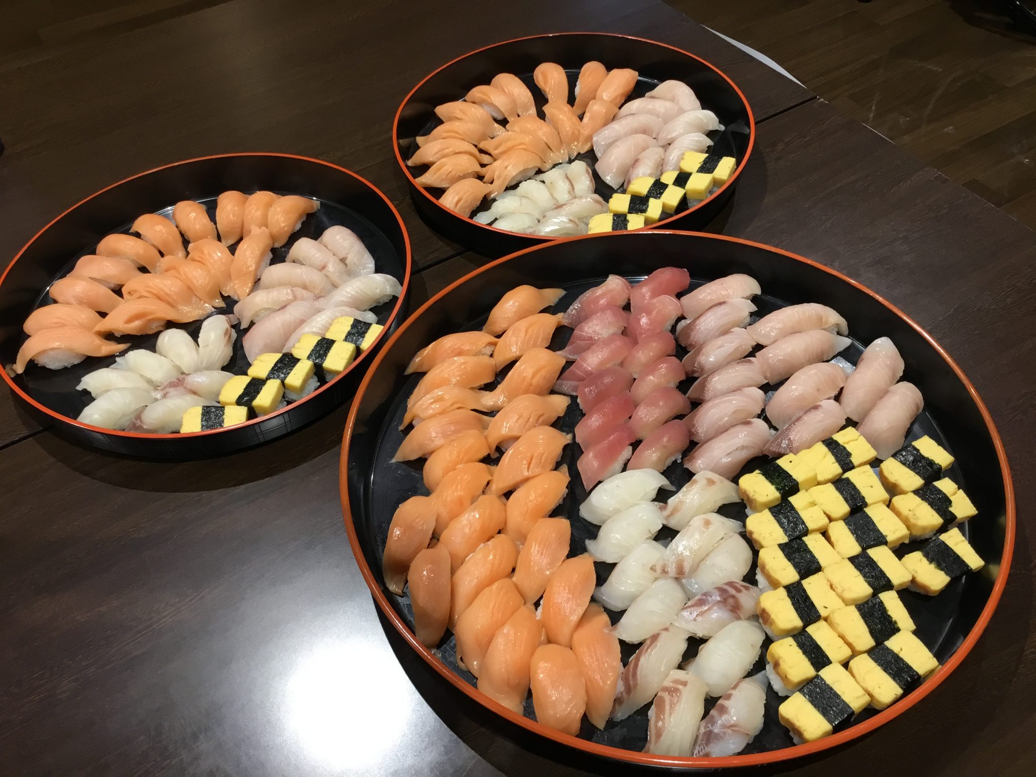 ネタは、マグロ、タイ、かんぱち、サーモン、エビ、タマゴ、アナゴ、いなり寿司、カッパ巻きと、9種類のお寿司を準備しました。