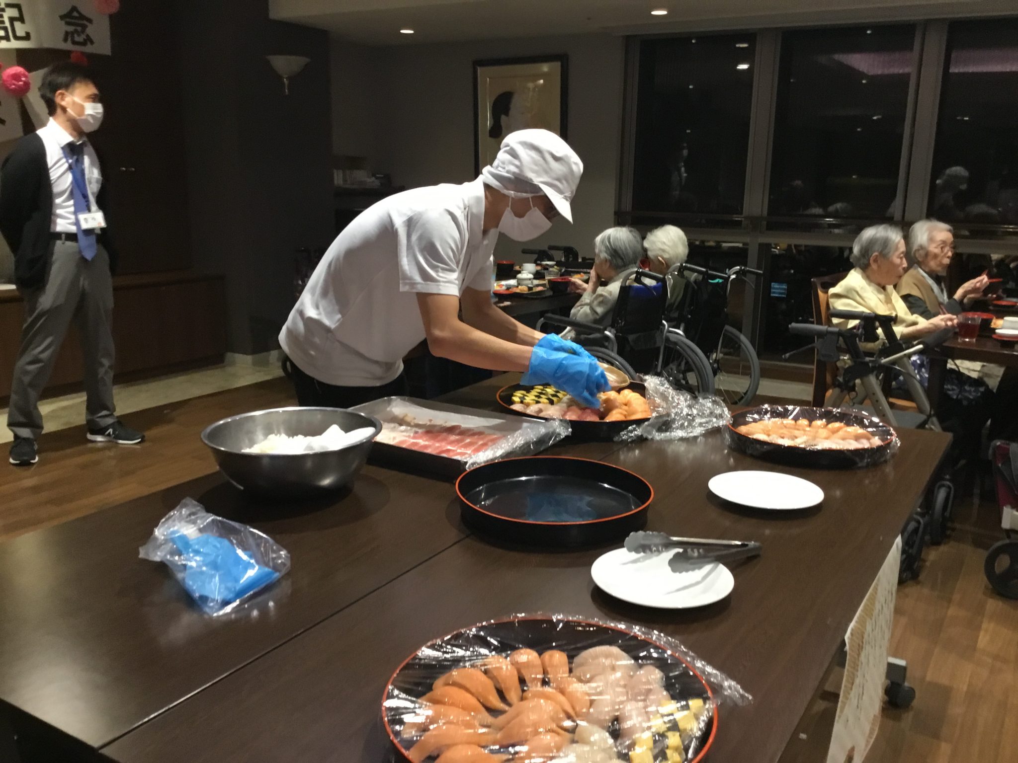 当日は厨房の調理師が各フロアに上がり、入居者様の前でお寿司を握りました。