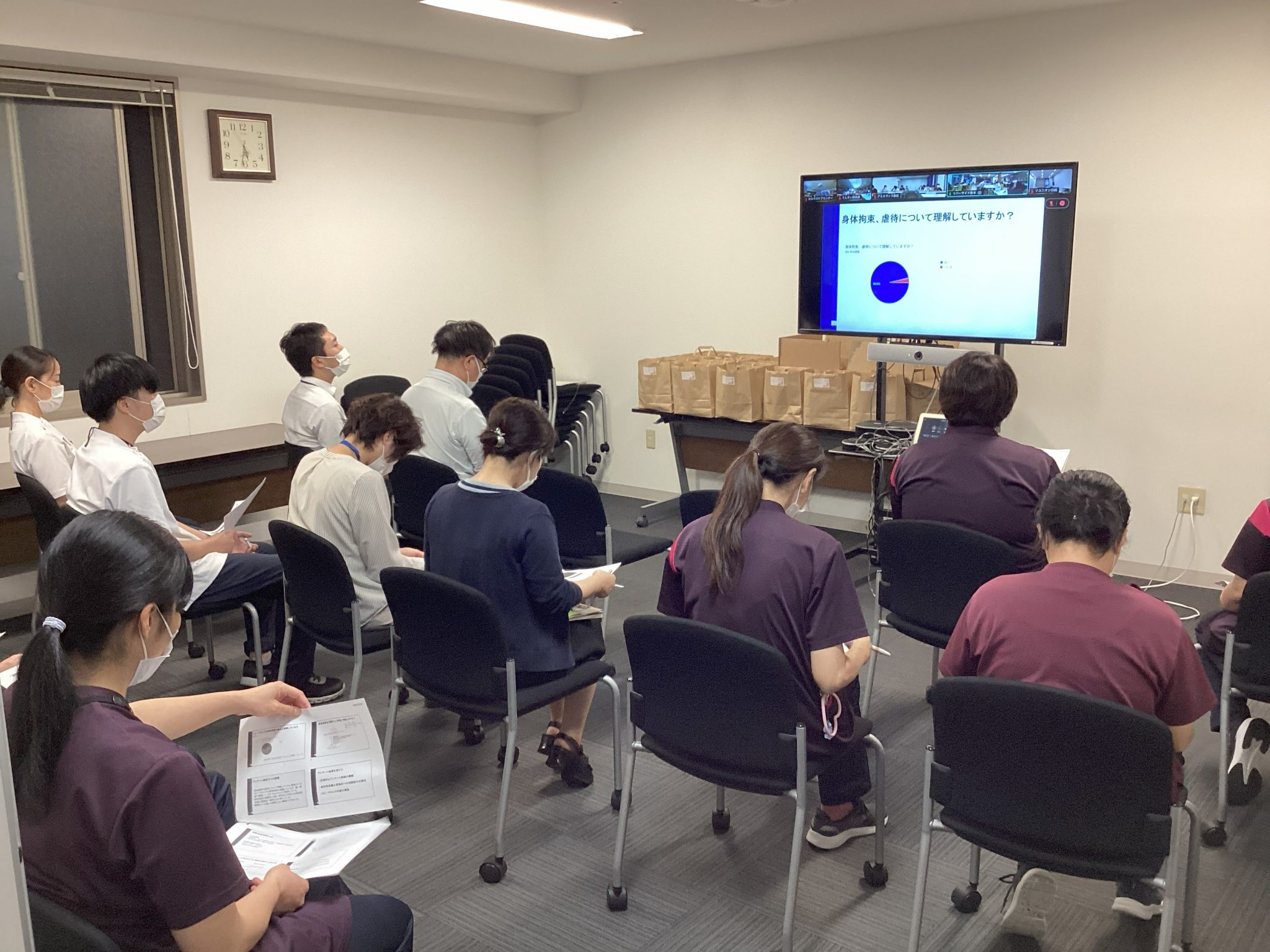 他法人であった事例などを参考に、「アンケート結果報告」「グレーゾーンとは」「グループワーク」の3つに分けて進められました。事前に職員に対して身体拘束に対するアンケートを実施されており、その結果報告もかねての勉強会です。
