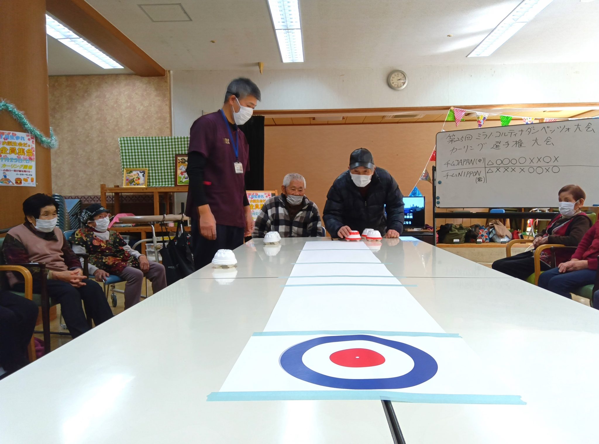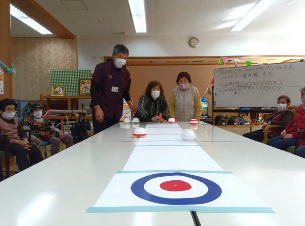 レクリエーションは冬季オリンピックで話題の「カーリング」をオリジナルストーンで開催。
