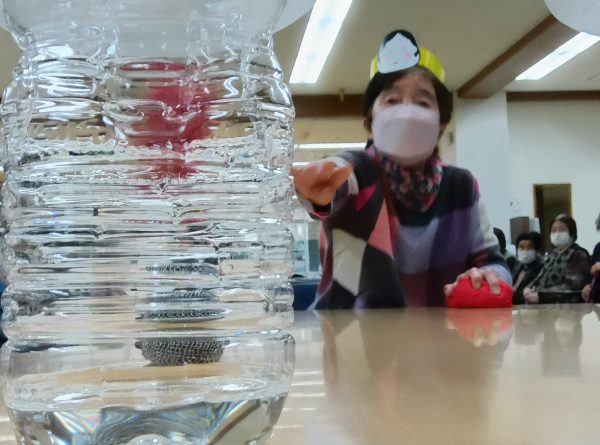 鬼のお面をつけたペットボトルに向かってお手玉を投げ当てるゲームで