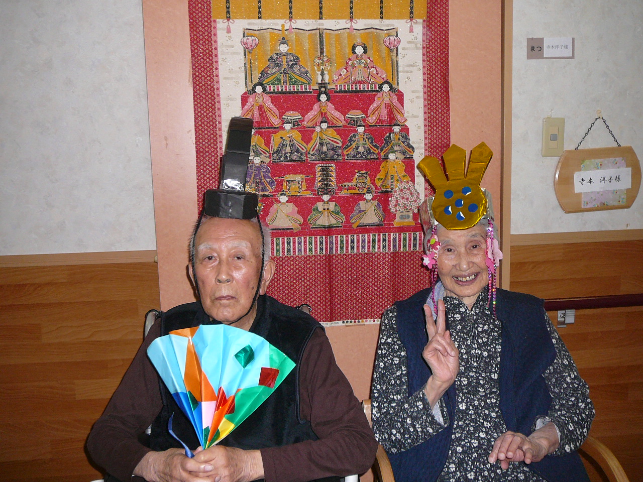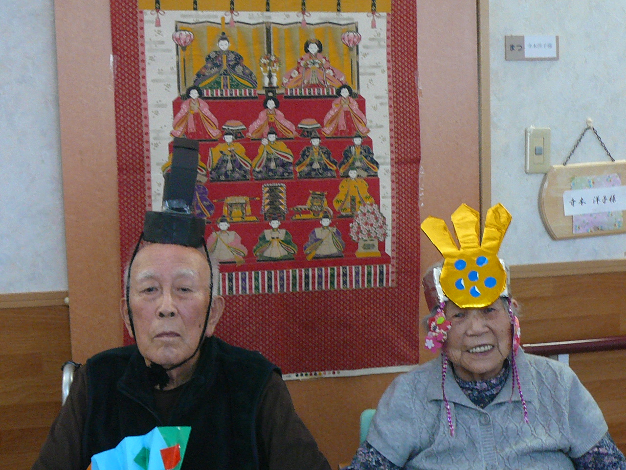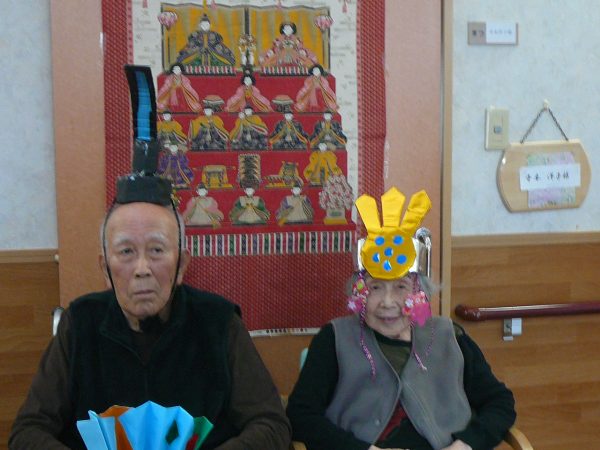 3月に入り、日差しが少しずつ春の暖かさを感じる時期になりました!(^^)! へたみ家では3月3日に桃の節句行事を行いました。 お内裏様、お雛様役になって頂き、ハイポーズ(≧▽≦)。 「昔は家でも飾ったね」、「お雛さんはわたしでよかとね?」と、会話も弾み素敵な笑顔を見せてくださいました。 おやつの時間には雛あられ、甘酒を提供しそこでも「昔は7段飾りが多かった」「今は家では飾ったりしよっとかな?」 と会話を楽しみ終了しました。