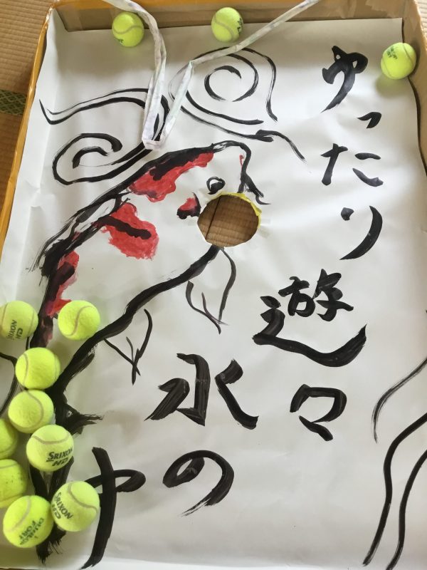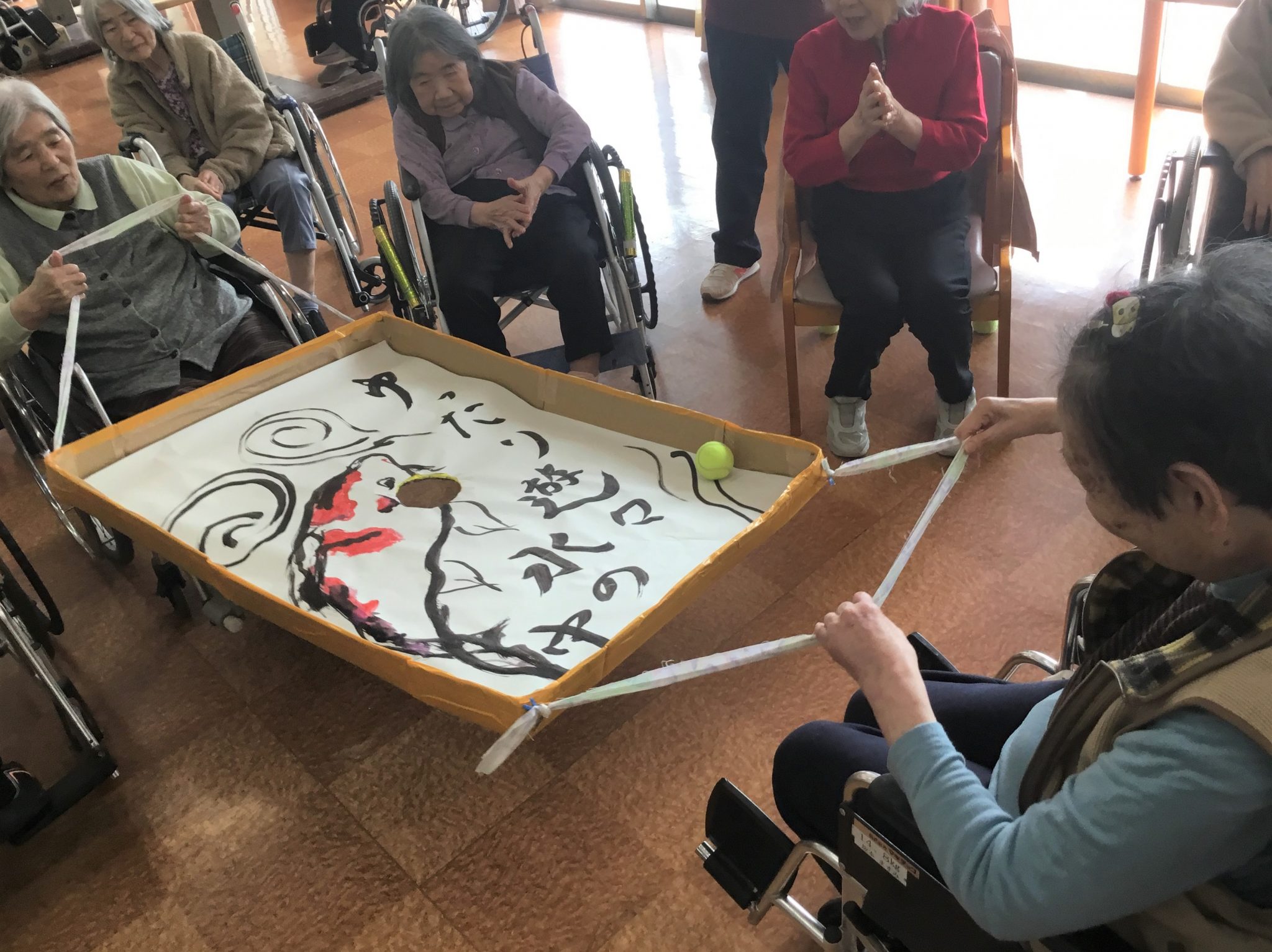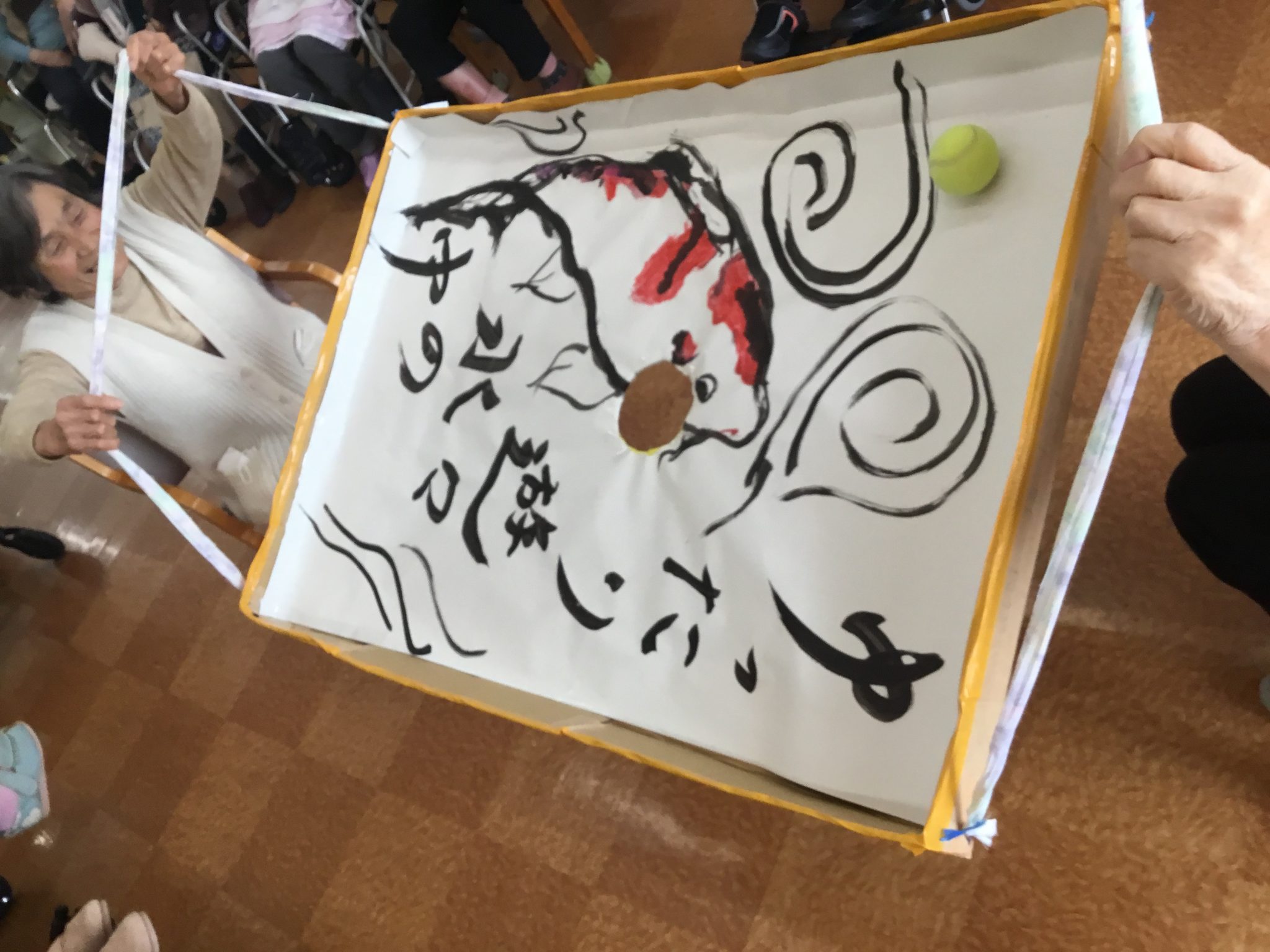 体操の後は、今月のレクリエーション「2人協力プレイ!ぐらぐらボール入れゲーム」を実施しました。