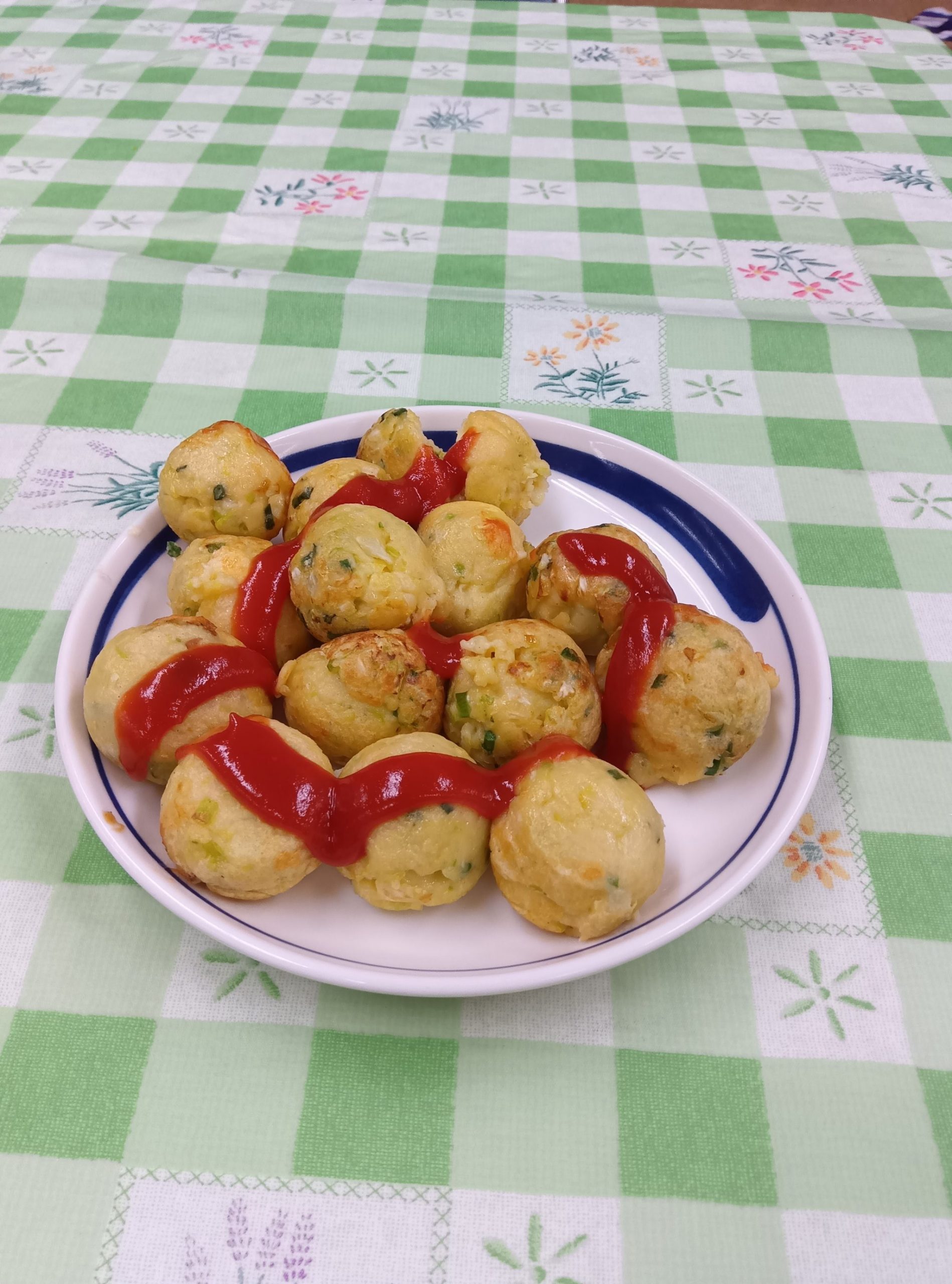 焼き上がったたこ焼きをお皿に並べ、見た目も鮮やかで食欲をそそります。