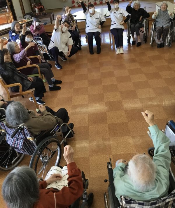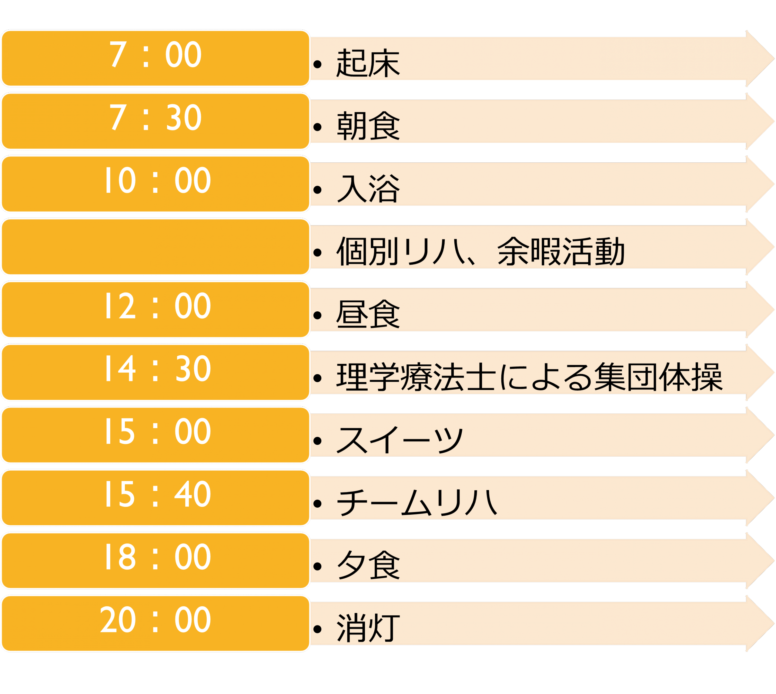 まずは一日の流れの中から「集団体操」と「チームリハビリ」について