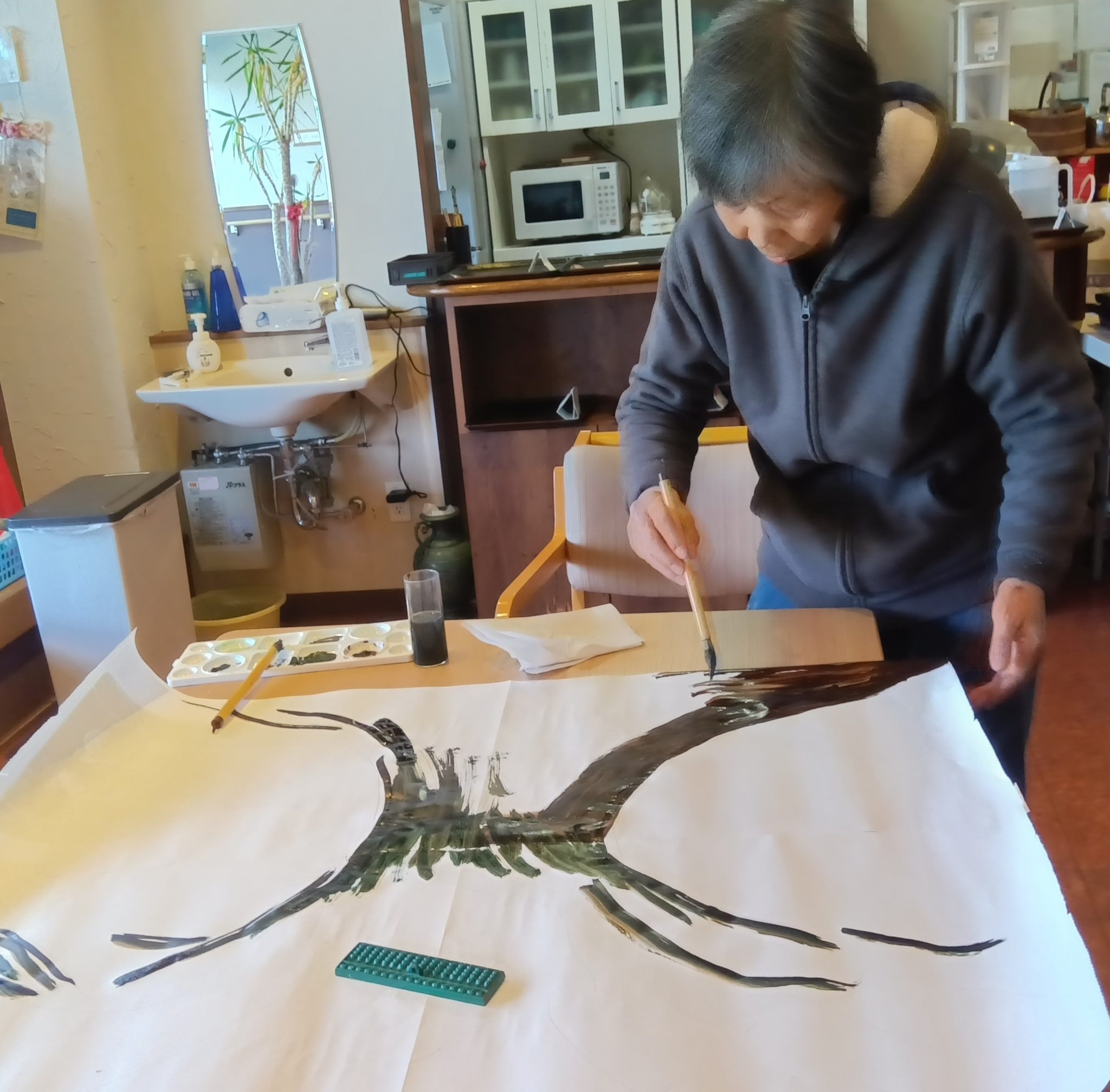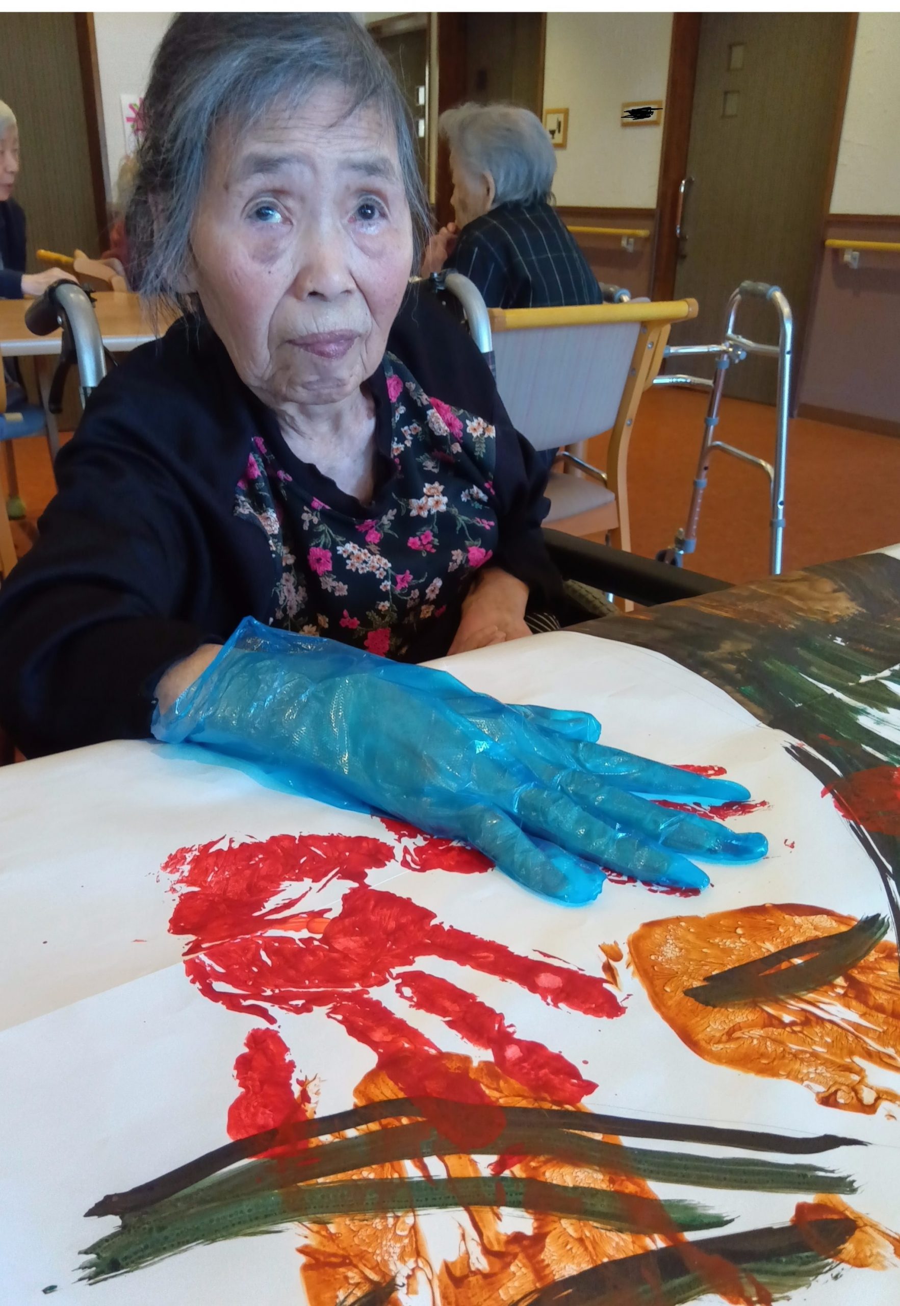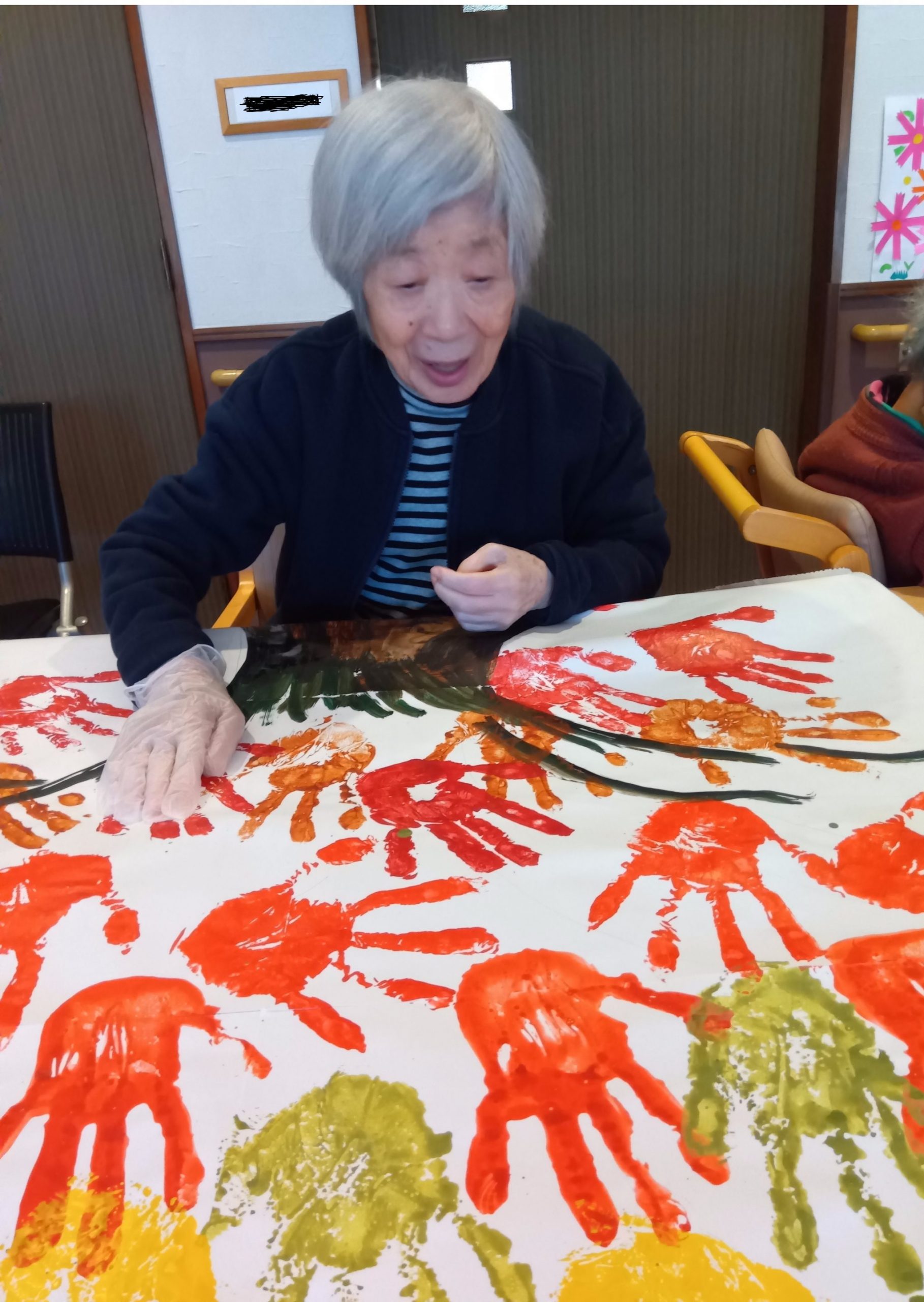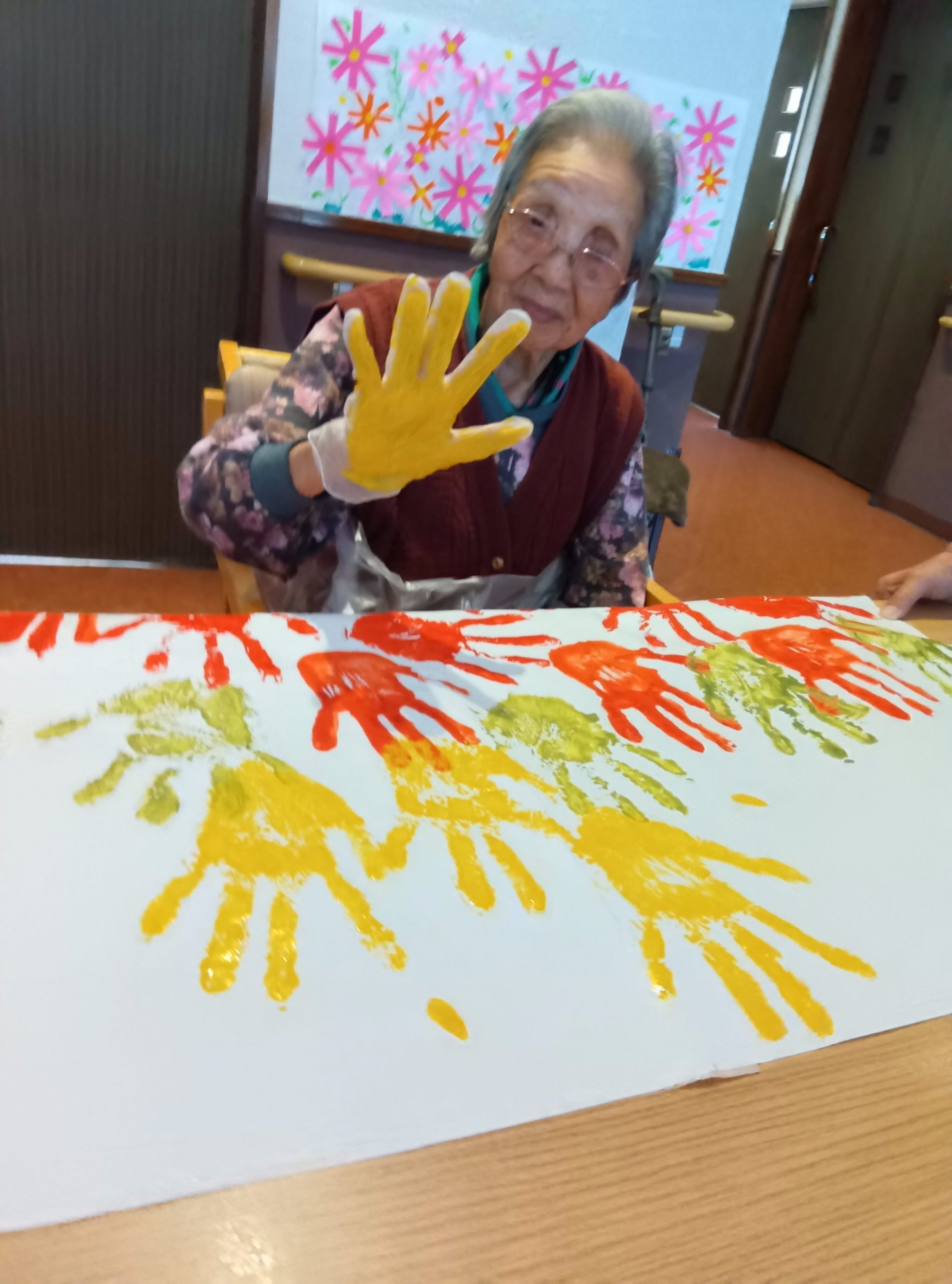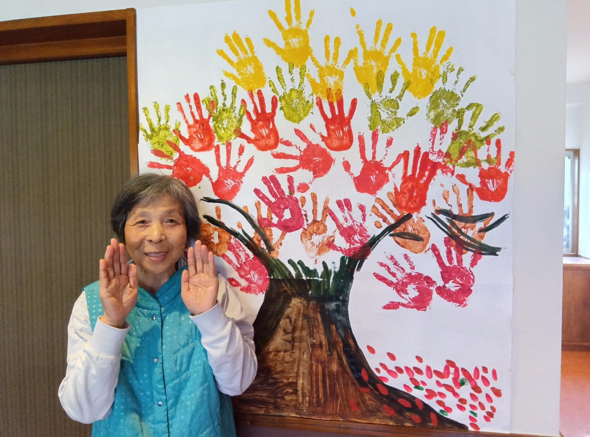 先日、ご利用者の皆さんと一緒に手形アートづくりを行い、大きな木を描き上げました。