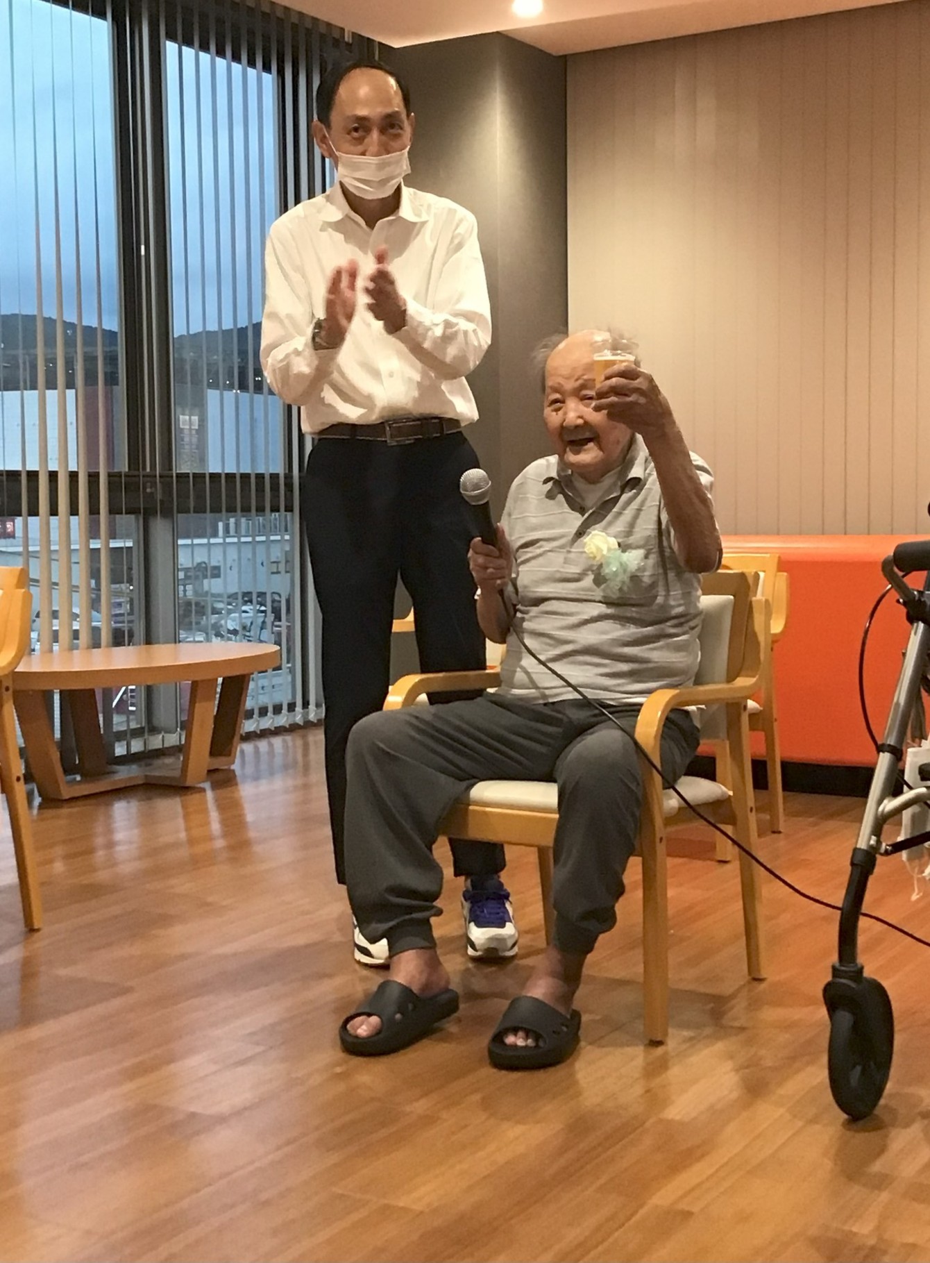 表彰後は百寿の表彰を受けた利用者様による乾杯の御発声にて食事会が始まり、それぞれのテーブルにて笑顔がこぼれていました。