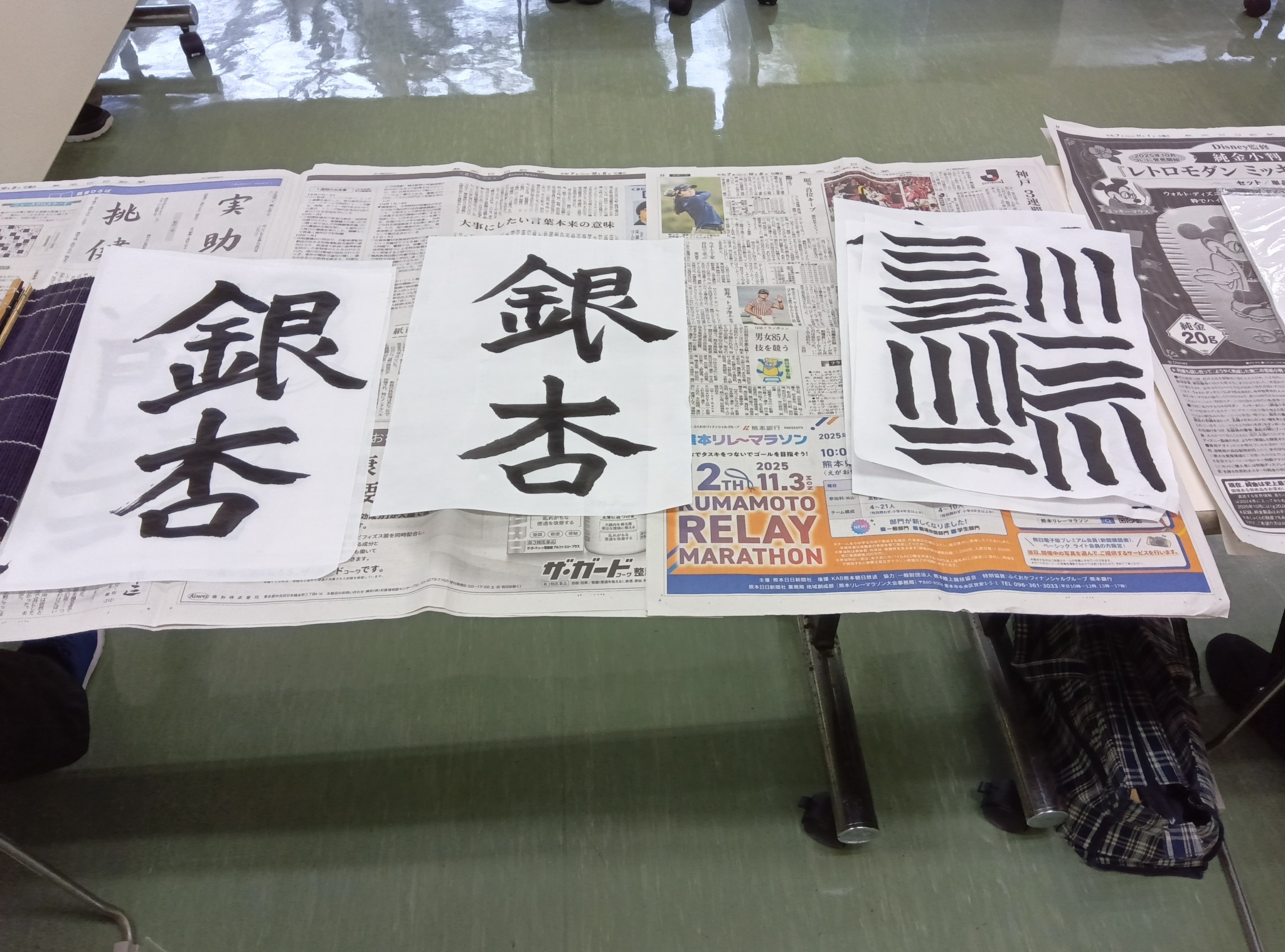 紅葉や収穫の話をしながら、皆さん思い思いの文字を筆に込めて書かれていました。