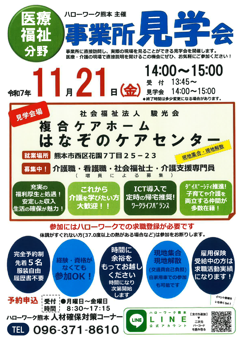 社会福祉法人 駿光会(しゅんこうかい) では、ハローワーク熊本主催の「医療・福祉分野 施設見学会」に参加します。