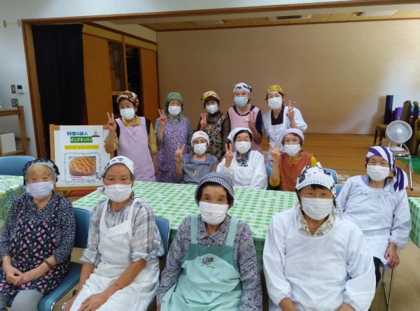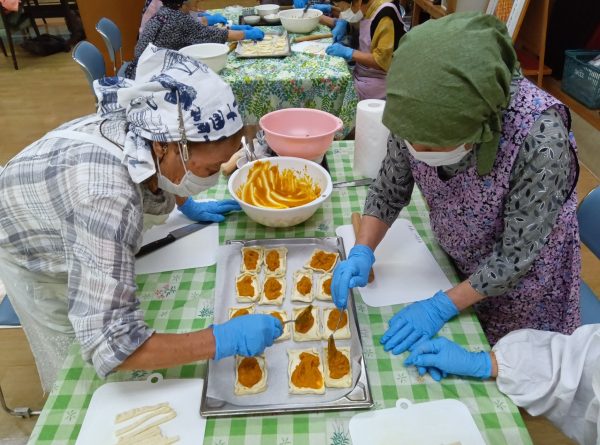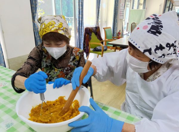厨房にて事前にカボチャの種抜きや皮むきを蒸してもらい、潰していく所から!